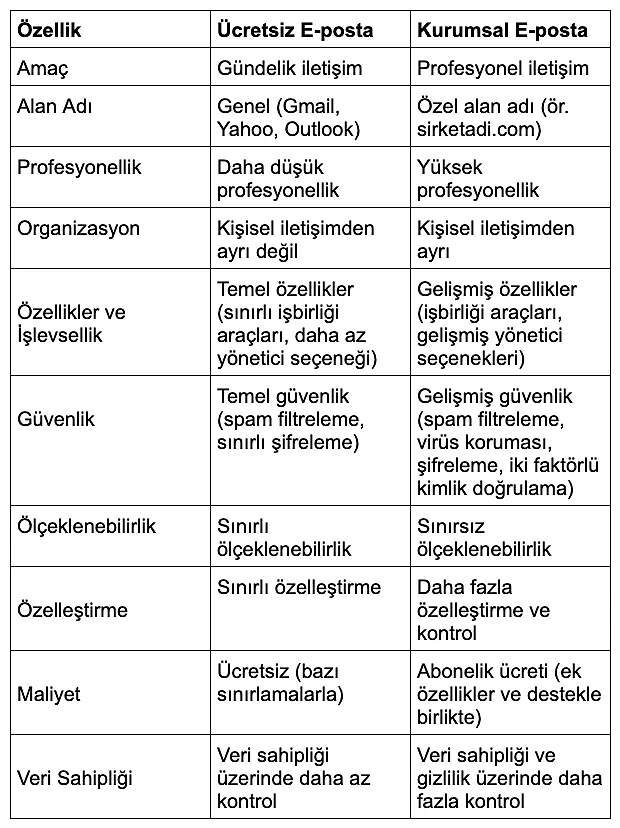 Aşağıda ücretsiz e-posta ile kurumsal e-posta hizmetleri arasındaki farkları karşılaştıran bir tablo bulabilirsiniz:
