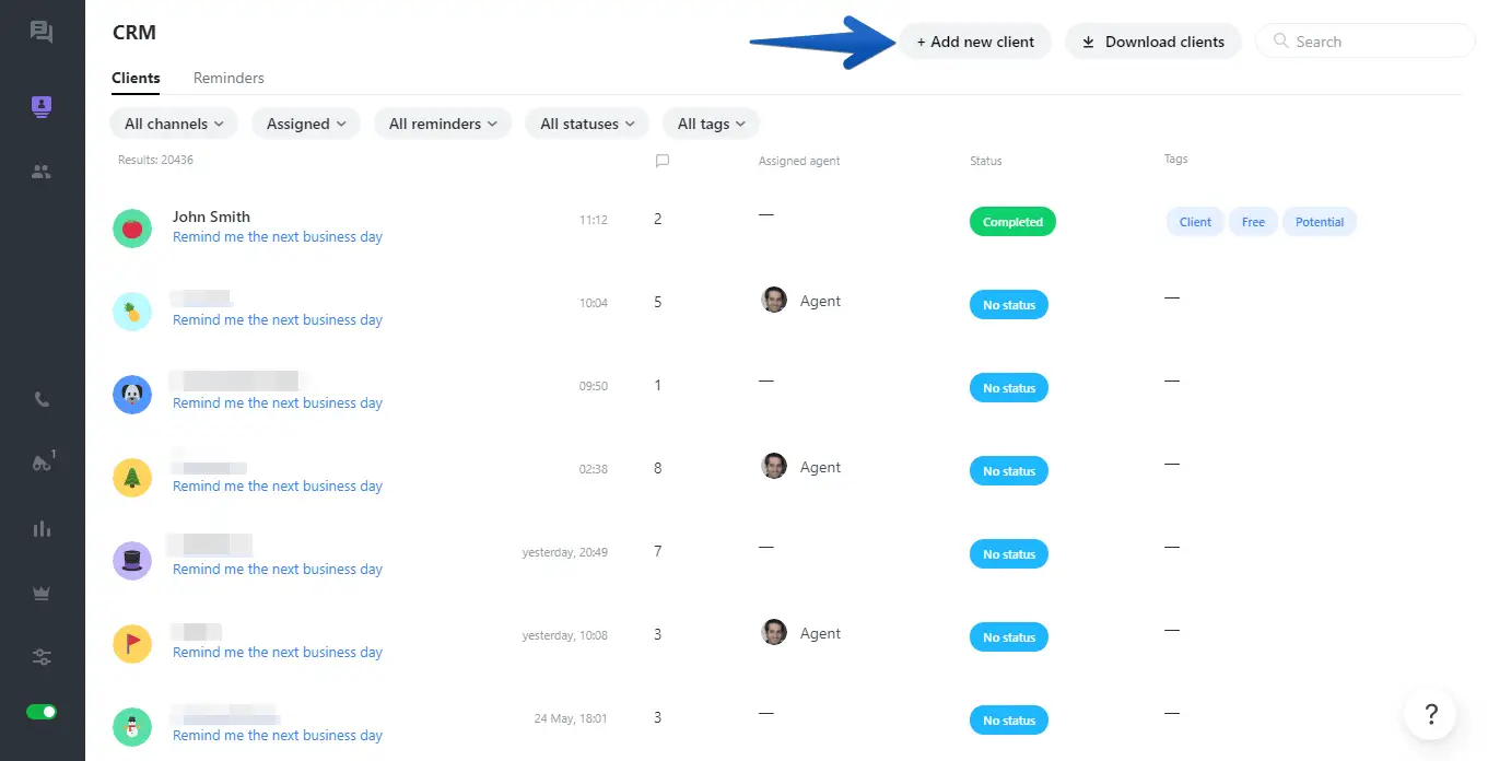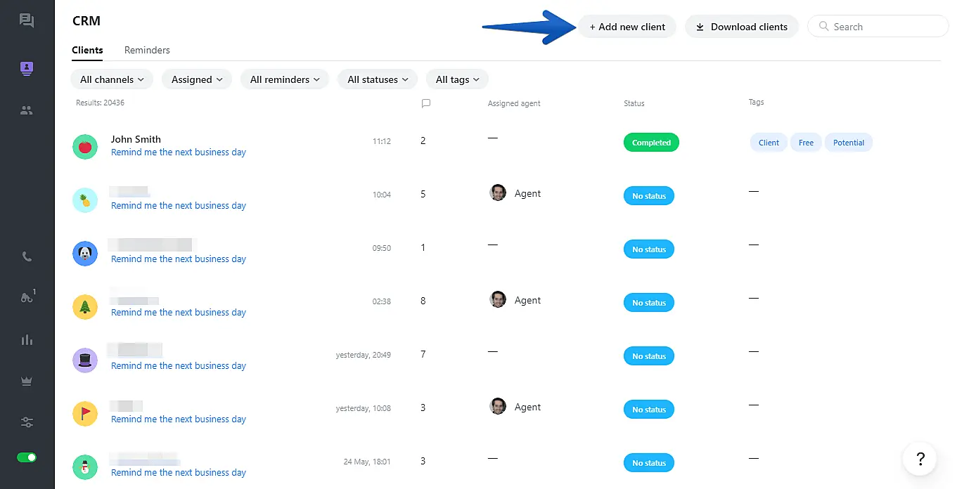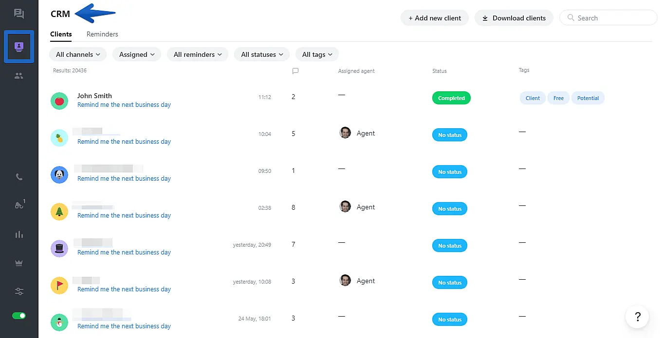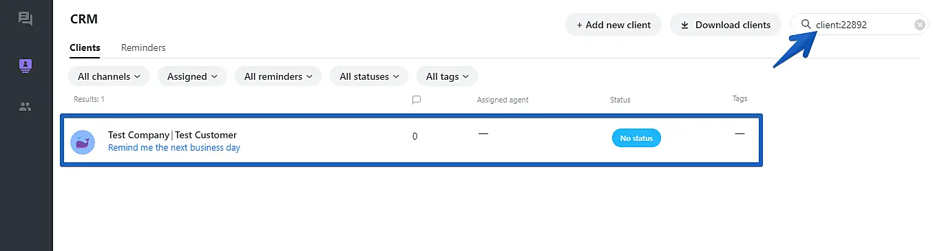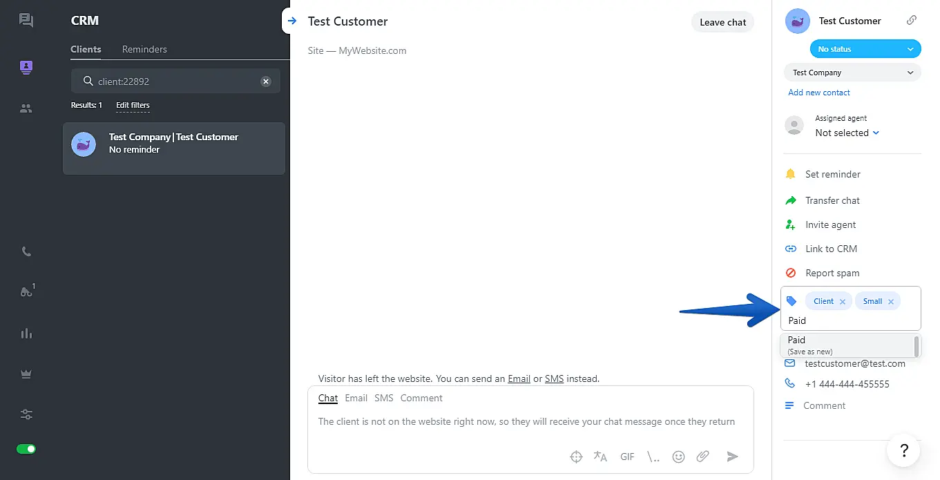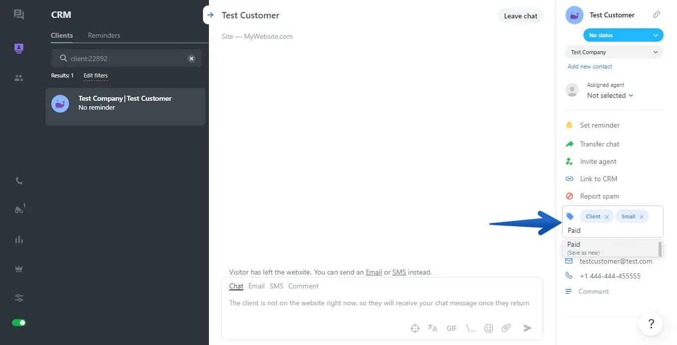 Yeni bir etiket eklemek için sohbet panelindeki etiketler alanını tıklamanız ve istediğiniz etiketi eklemeniz yeterlidir. Her istemciye istediğiniz sayıda etiket ekleyebilirsiniz. Artık belirli bir etikete ihtiyacınız yoksa, bunları sistemden tamamen kaldırabilirsiniz. Bunu yapmak için, müşterileri söz konusu etikete göre filtrelemeniz ve bu etiketi her birinden kaldırmanız gerekir. Belirli bir etiket artık mevcut herhangi bir istemcide kullanılmadığında, sistemden otomatik olarak kaldırılır.