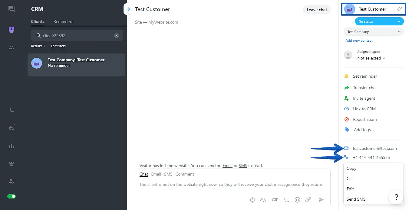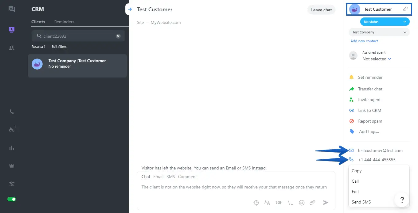 İletişim kutusunun kendisinde müşterinin verilerini düzenleyebilirsiniz. Bunu yapmak için sohbete gidin ve düzenlemek için müşterinin adının üstüne tıklayın. Müşterinin e-postasını veya telefon numarasını tıkladığınızda, diğer işlemler için bir açılır liste görünür ve Düzenle seçeneğini tıklayarak müşterinin iletişim bilgilerinde ayarlamalar yapabilirsiniz.