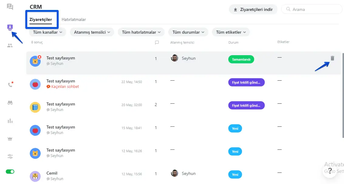 CRM -> Ziyaretçiler bölümdeyken imleci, silmek istediğiniz ziyaretçinin üzerine getirin ve sağda çıkacak "çöp kutusu" simgesine tıklayın.