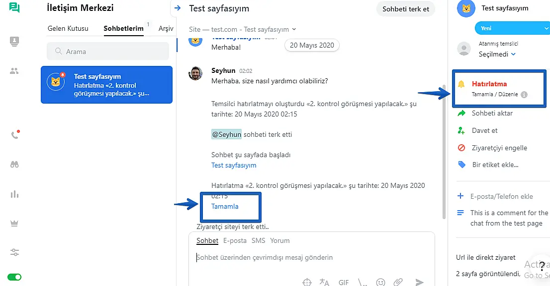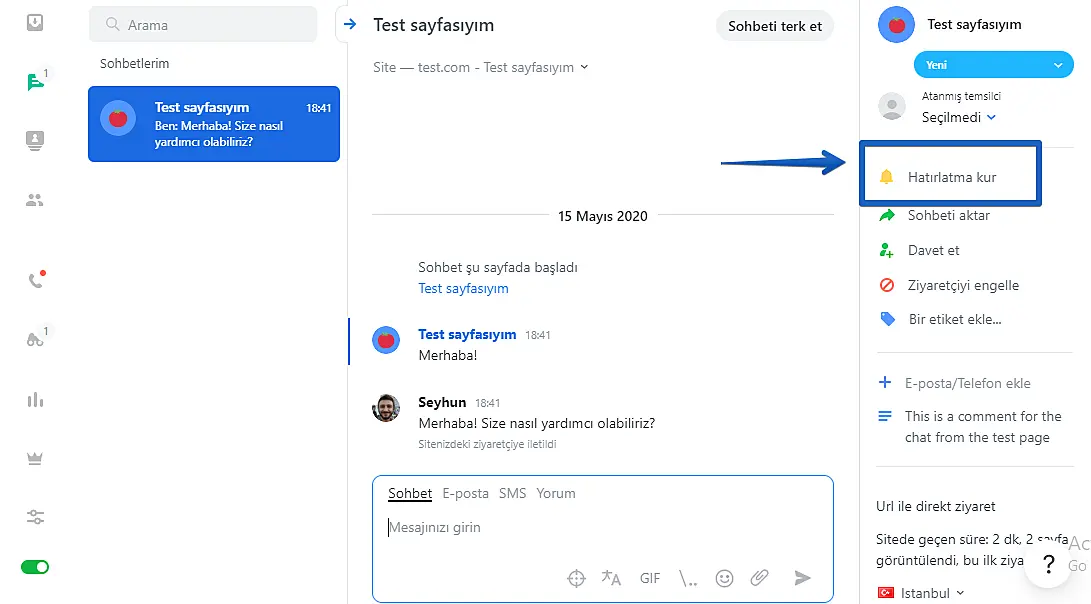 JivoChat uygulamanızdaki mevcut bir görüşmeye hatırlatıcı eklemek için görüşme penceresinin sağ üst köşesindeki "Hatırlatma kur" butonuna tıklayın.