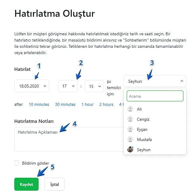 4. Hatırlatmayı hangi sebeple kurduğunuzu açıklayın. 3 nuamralı bölümde girmiş olduğunuz temsilci bu açıklamayı görebilecek. Bu alan isteğe bağlıdır;