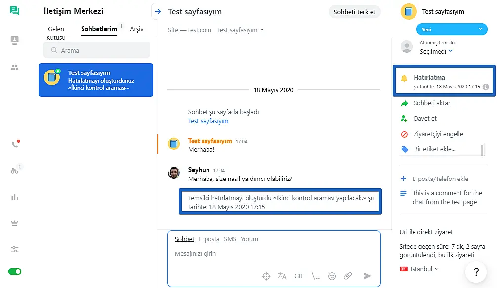 Hatırlatmayı oluşturduktan sonra, sohbetin içerisinde bu şekilde gözükecek.