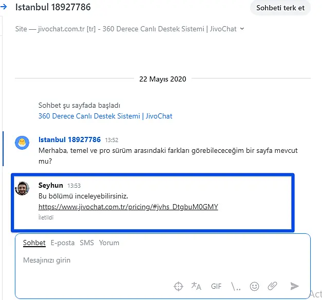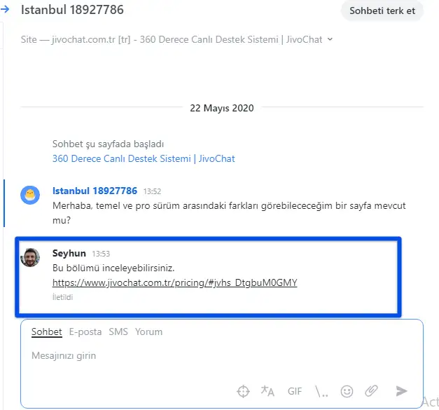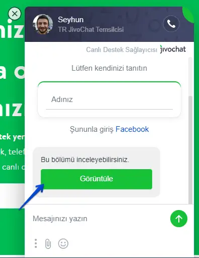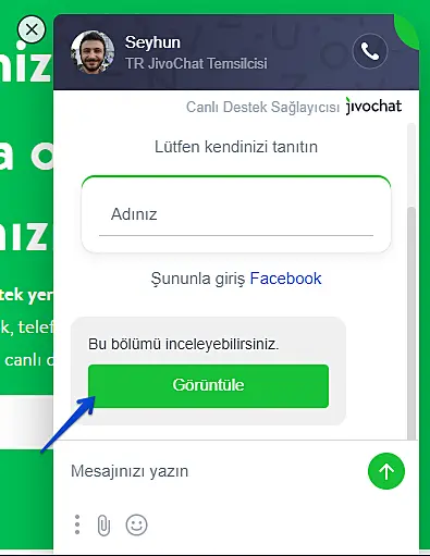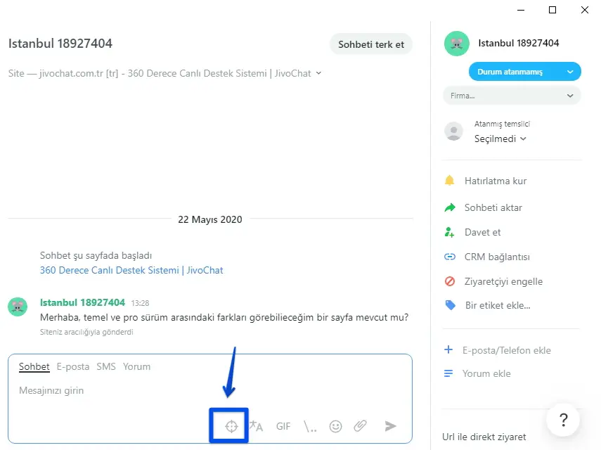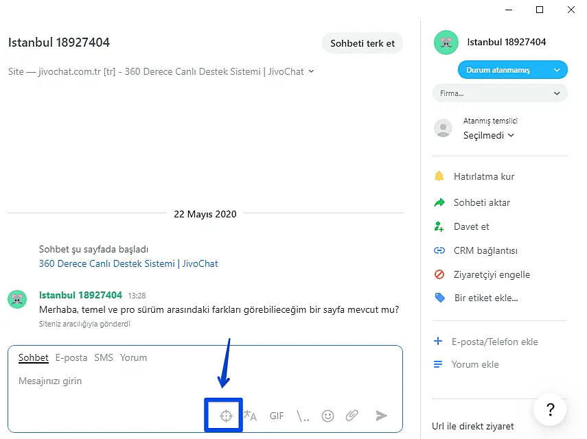 Sohbet ederken, alt kısmında, temsilcinin mesajını yazdığı bölümün hemen altındaki hedef simgesine tıklayın. Resimdeki gibi: