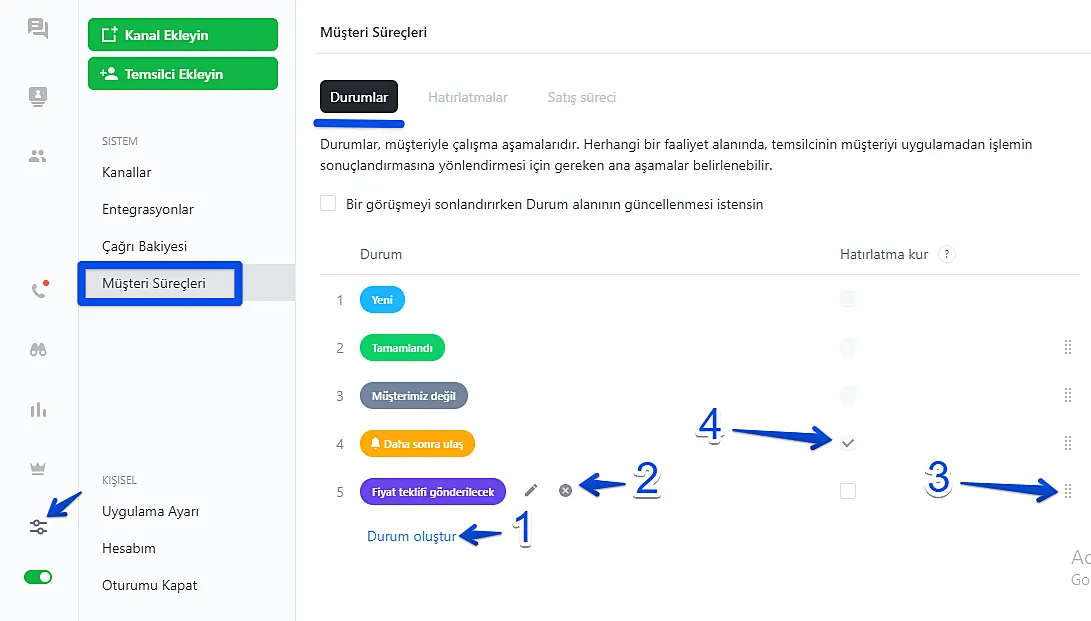 "Durumlar" özelliği için ayarlara, JivoChat uygulamasında Yönet -> Müşteri Süreçleri yolu ile ulaşabilirsiniz.