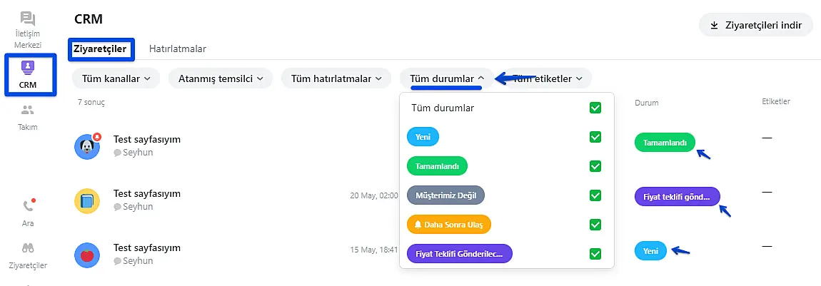 Ve… "Belirli bir durum atanmış olan ziyaretçilerin listesini nasıl görebilirim?" sorusuna cevabımız şimdiden hazır. CRM -> Ziyaretçiler bölümünde, atanmış duruma göre bir filtre bulacaksınız. Bu durumda, bu bilgi, sistemimiz tarafından oluşturulan excel dosyasında ziyaretçileri indirirken de mevcut olacaktır.