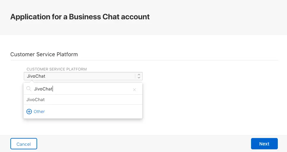 Bu noktada JivoChat ile bağlantı kurabileceksiniz. Business Chat hesap ayarlarınızı açın -> "Müşteri Hizmetleri Platformu Yapılandırması" bölümü (Customer Service Platform Configuration)-> "JivoChat'a bağlan"ı (Connect to JivoChat) tıklayın.