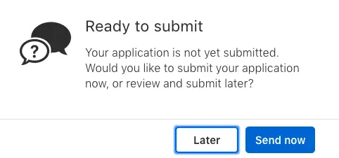 Tüm verileri belirledikten sonra, derhal değerlendirilmek üzere başvuruyu göndermeniz istenecektir. Bununla birlikte, bunu biraz ertelemek ve ek alanları doldurmak daha iyidir. "Sonra"ya (Later) tıklayarak devam edin.