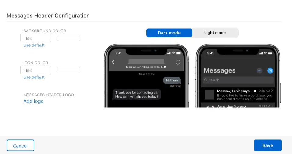 Ardından, "İleti Başlığı Yapılandırması" bölümünde (Messages Header Configuration), iletişim başlığınızın, sohbetteki gezinme düğmelerinin ("Bilgi" ve "Geri") renklerini ayarlayın ve logolarınızı yükleyin.