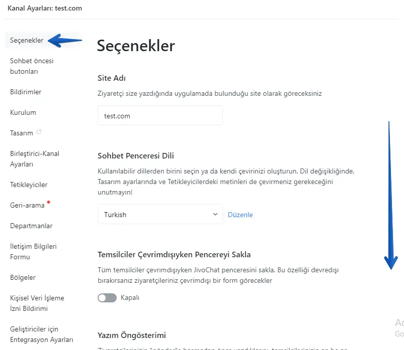 Alt kısımda "JivoChat Simgesini Gizle" seçeneğini aktifleştirerek, sohbet penceresinden kaldırabilirsiniz. Varsayılan olarak kapalıdır. Gizlemek için üstüne tıklayın ve yeşil hale geldiğinde JivoChat simgesi gizlenecektir.