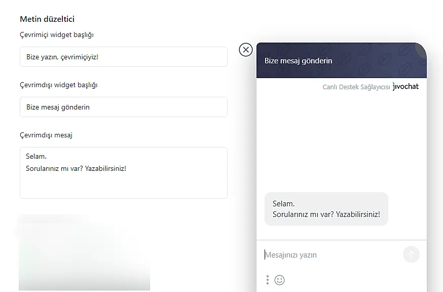 Web sitenizde herhangi bir kod düzenlemenize gerek kalmadan JivoChat penceresinin metinlerinde, renklerinde, konumunda ve şeklinde değişiklikler yapabilirsiniz. Aynı sayfada, mevcut ayarların bir ön izlemesini göreceksiniz(sitenizde nasıl görüneceğini), mevcut ayarları kaydettikten sonra, tüm değişiklikler web sitenize anında uygulanacaktır.