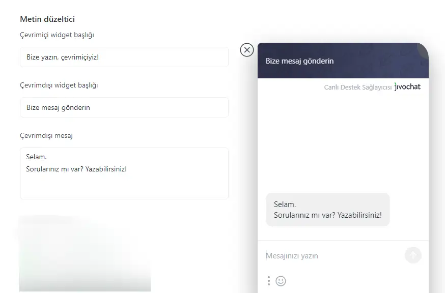 Ayrıca bu sekmede çevrimdışı ileti biçiminin metnini değiştirebilirsiniz (ziyaretçi sohbet düğmesini tıklatarak sohbet ekranını manuel açtığında gösterilir).