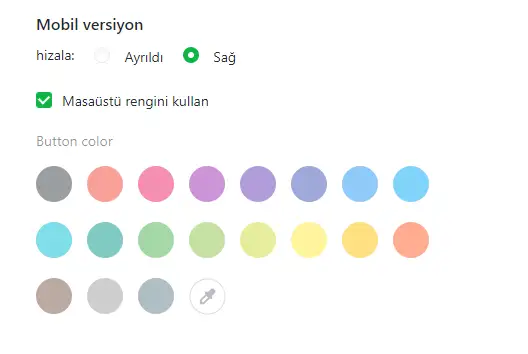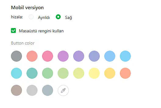 Sitenizin mobil sürümünde de sohbetin görünümünü özelleştirmeniz mümkündür. Sohbet butonunun rengini önerilen renklerden seçebilir, hatta kendi renginizi özelleştirebilirsiniz. Masaüstü widget'ınızla aynı renkleri kullanmak için "Masaüstü rengini kullan" seçeneğini işaretleyebilirsiniz. Ek olarak, sohbet düğmesinin hangi tarafta bulunacağını seçebilirsiniz: sağda veya solda.
