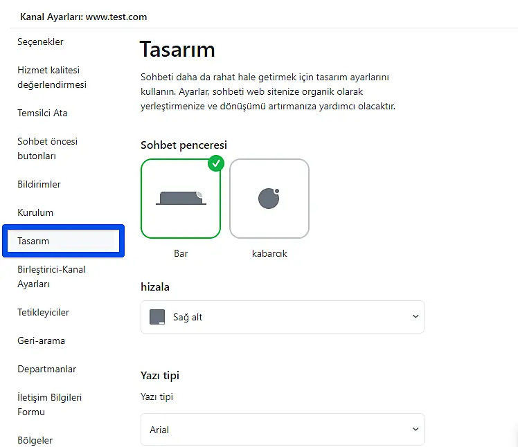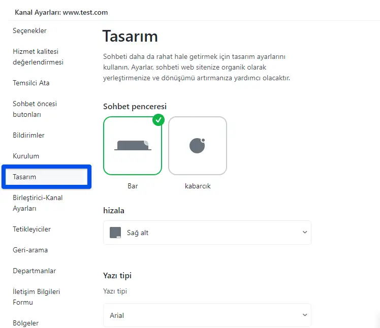 Sohbet penceresinin konumunun sohbet butonunun yerleştirilmesi ile tanımlandığını lütfen unutmayın. Buton ekranın sol tarafındaysa (alt / merkez / kenar görünümler), web sitesindeki sohbet penceresi ekranın sol alt tarafında açılacaktır. Aynı şekilde buton sağ tarafa ya da ortaya yerleştirilirse sohbet penceresi ekranın sağ alt köşesinde açılacaktır.