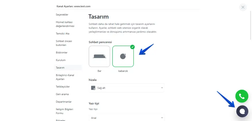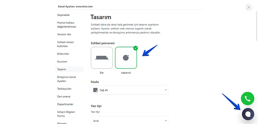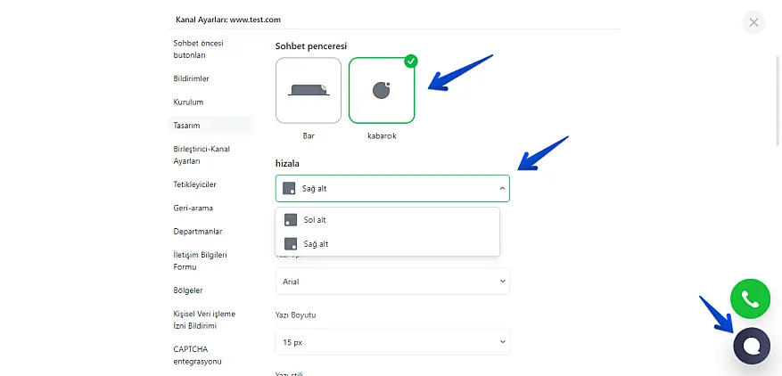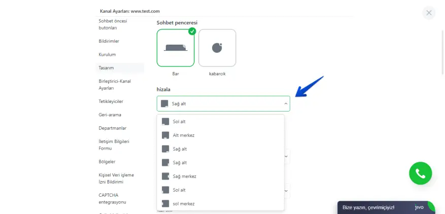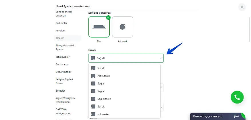 Renk düzeninin yanı sıra ayarların belki de en önemlisi, butonun ve sohbet penceresinin konumu veya daha doğrusu hizmetimizin sitenizde tam olarak nerede bulunacağıdır.
