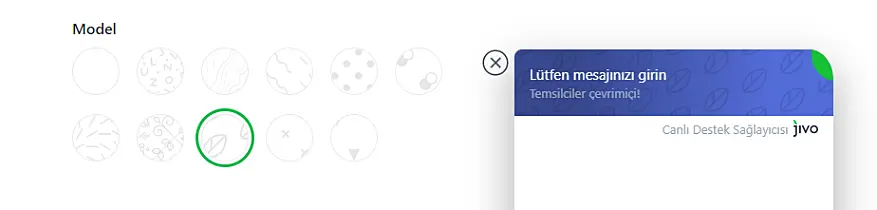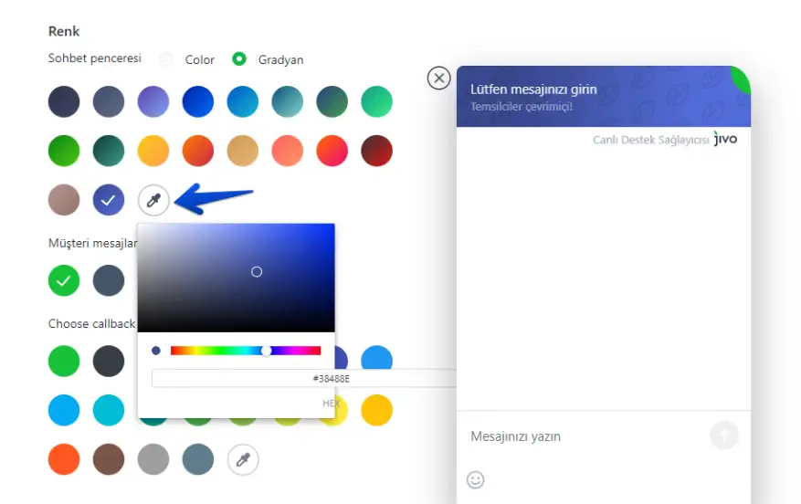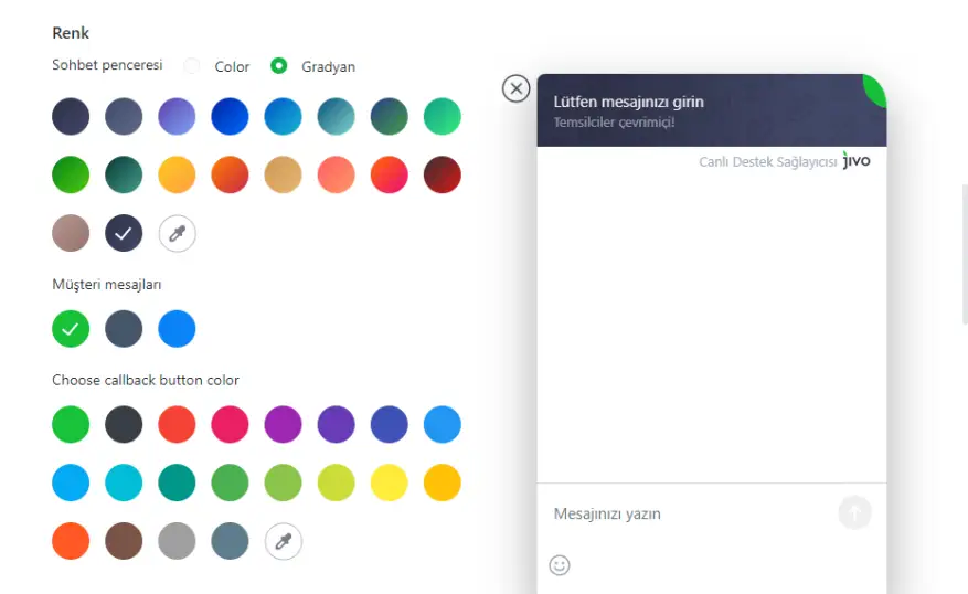Bu bölümde ayrıca müşteri mesajlarının arka planını ve geri arama butonunun rengini ayarlayabilirsiniz. Bu renkler önerilen renkler listesinden seçilebilir.