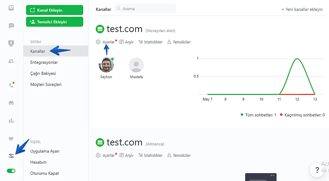Hiçbir temsilciniz çevrimiçi değilken sohbet penceresini saklamak için önce uygulamayı açın ve ardından Yönet -> Kanallar -> Sitenizin adının altındaki "Ayarlar"a tıklayın: