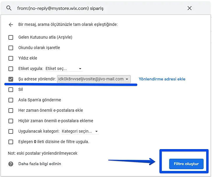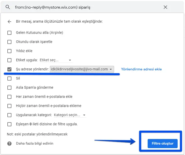 Ardından, filtrelenmiş e-postalarla ne yapmanız gerektiğini seçin - "Şu adrese yönlendir:" (JivoChat e-postayı seçin) ve "Filtre oluştur" a basın.