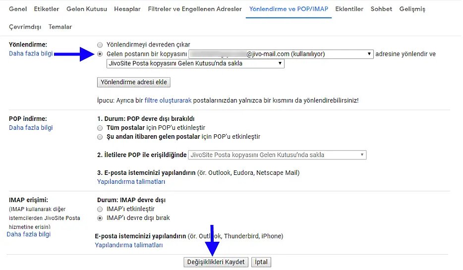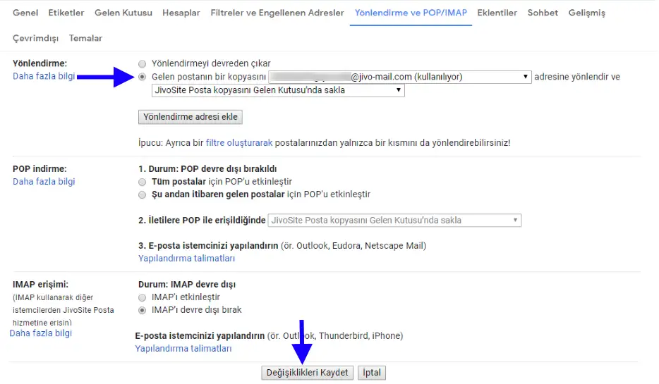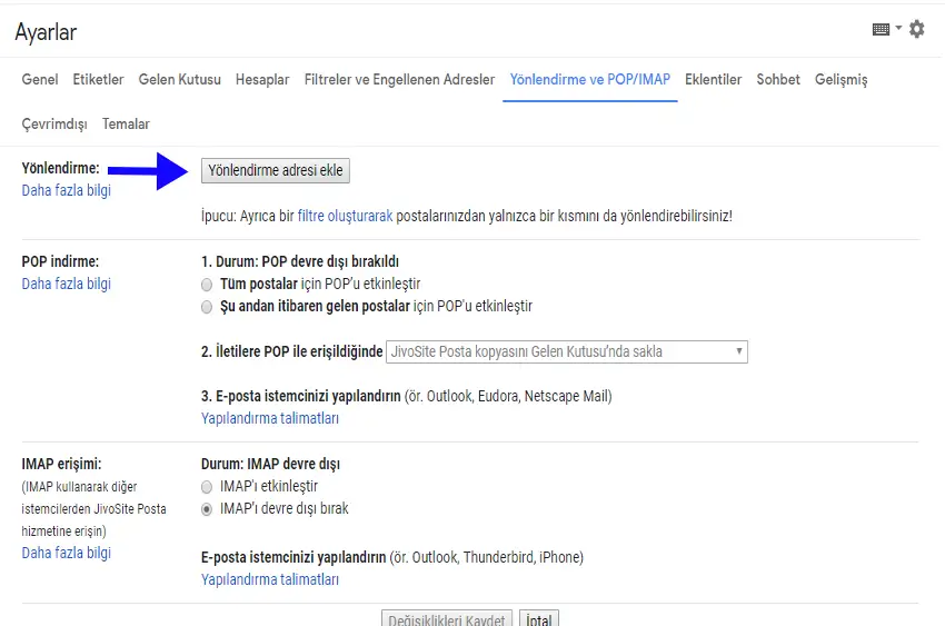 2.Yönlendirme ve POP/IMAP başlığına tıklayıp "Yönlendirme adresi ekle" butonunu seçin.