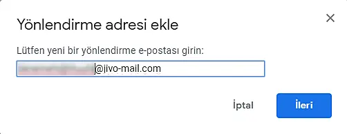 3.Daha önce JivoChat’ten kopyaladığınız e-posta adresini yapıştırın "İleri" butonuna tıklayın.