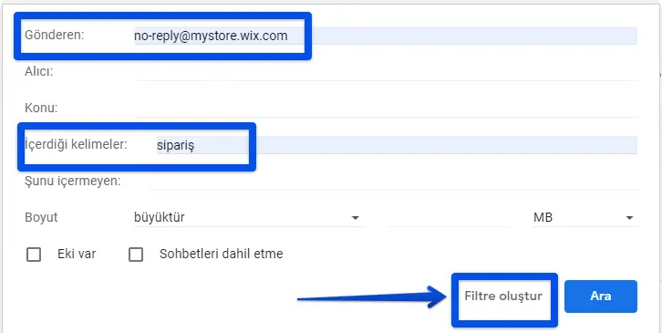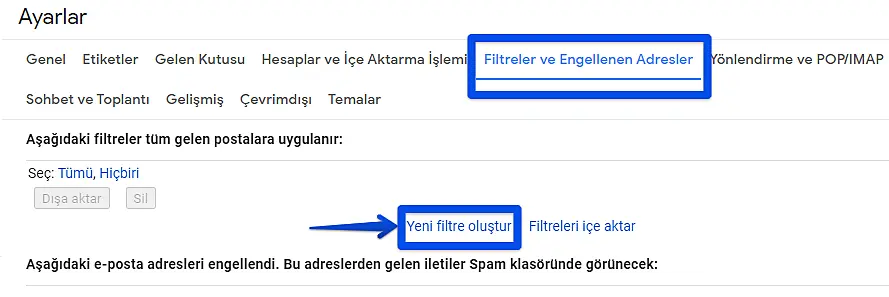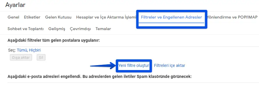 Gmail hesabınızda "Ayarlar" > "Tüm ayarları görüntüleyin" > "Filtreler ve Engellenen Adresler" > "Yeni filtre oluştur" adımlarını izleyin.