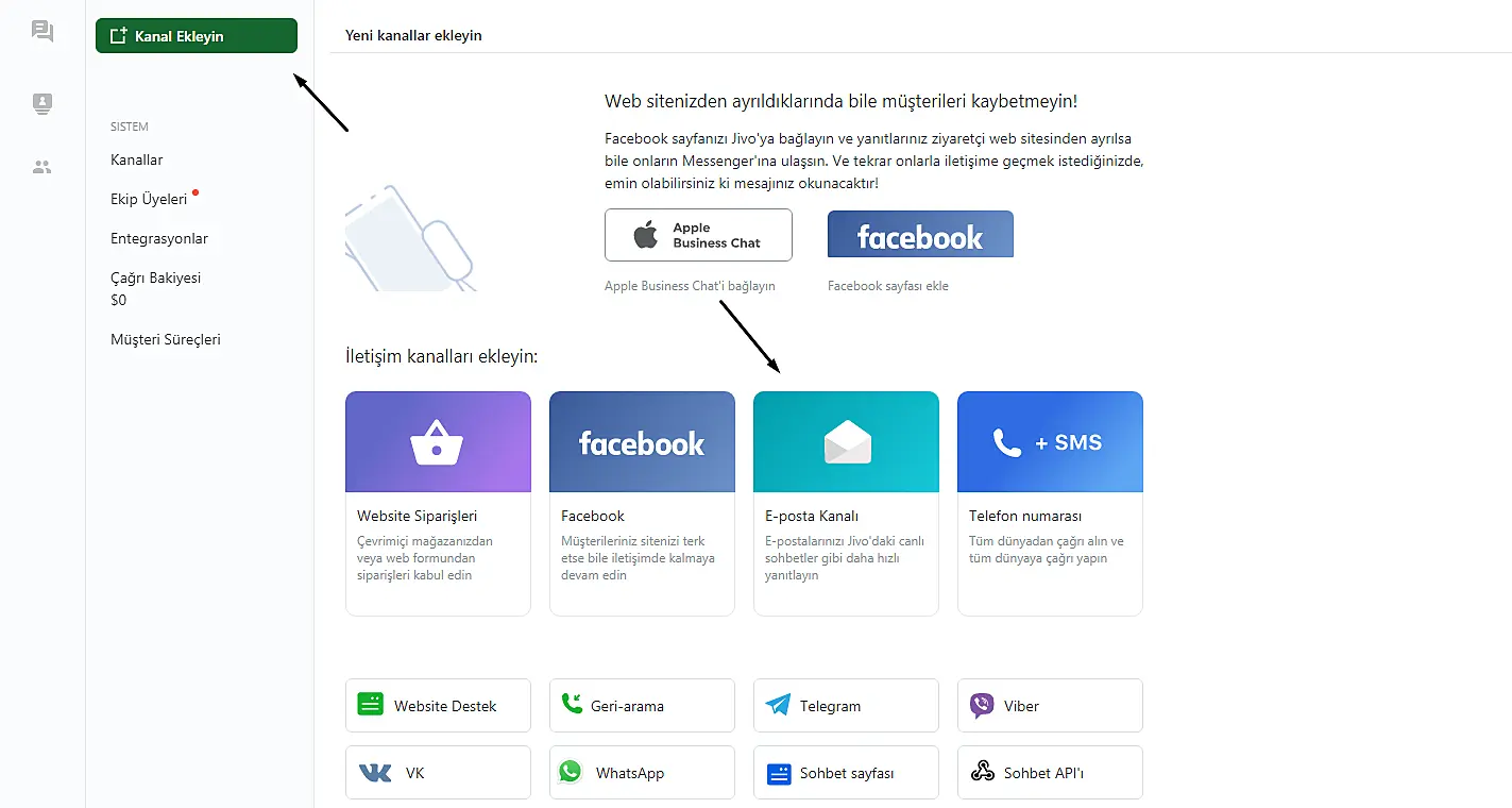 JivoChat aracı uygulamasını açın veya masaüstü uygulamamızı kullanın ve "Yönet" -> "Kanallar" a gidin, önerilen kanallar arasında "E-Posta Kanalı" na tıklayın.
