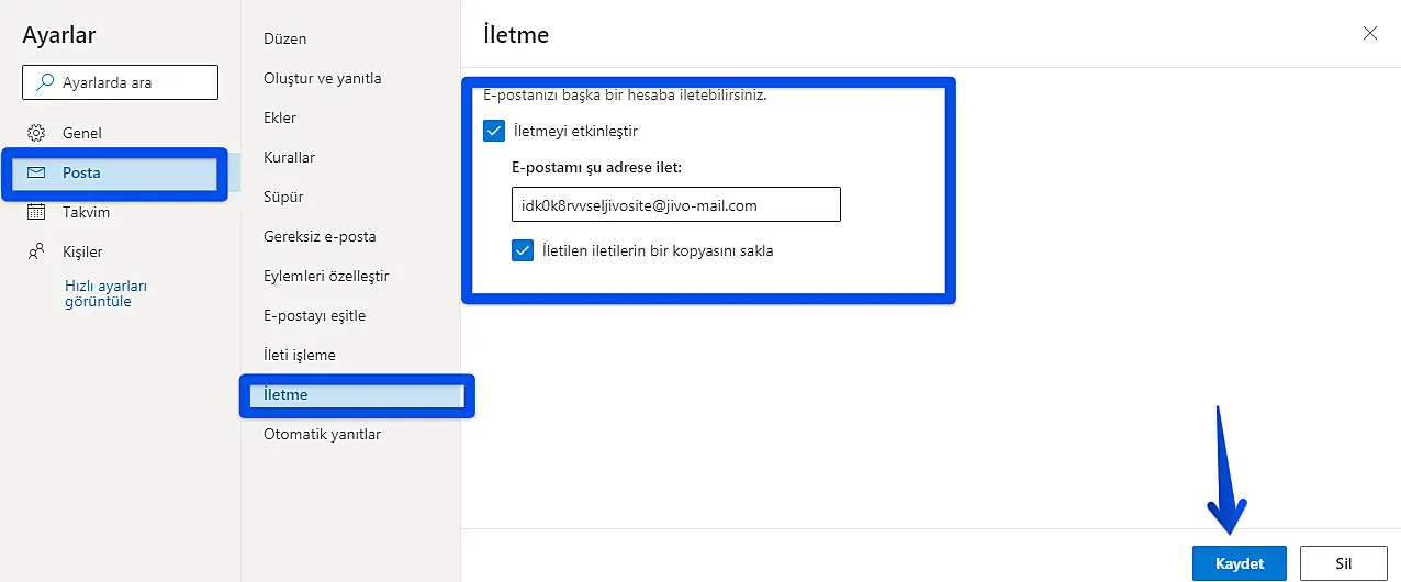 2. Ayarlar penceresinde "Posta" > "İletme", "İletmeyi etkinleştir" seçeneğini işaretleyip, JivoChat'dan aldığınız yönlendirme mail adresini girerek "Kaydet" butonuna tıklayın.