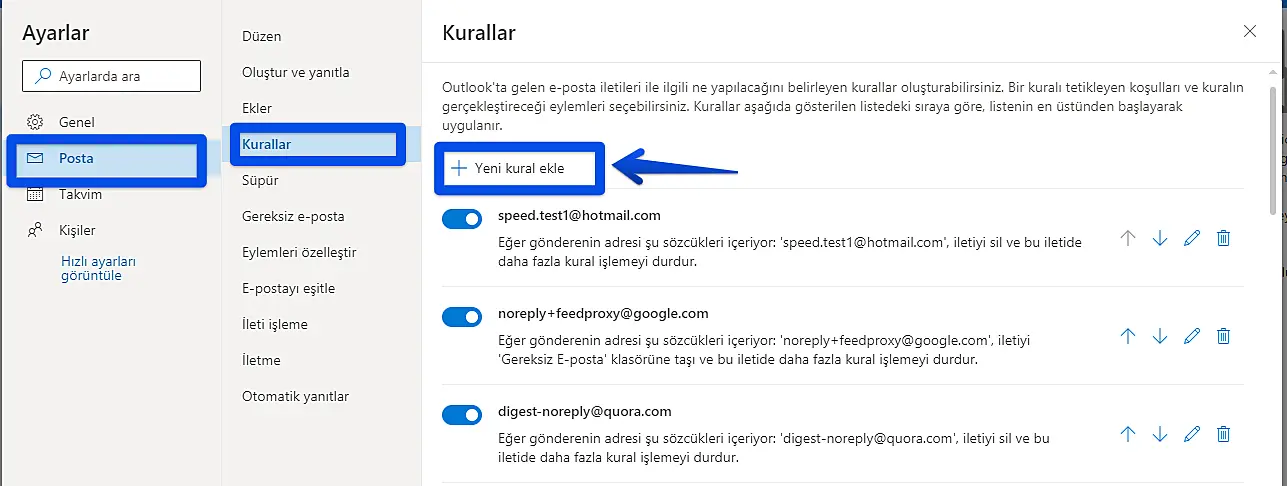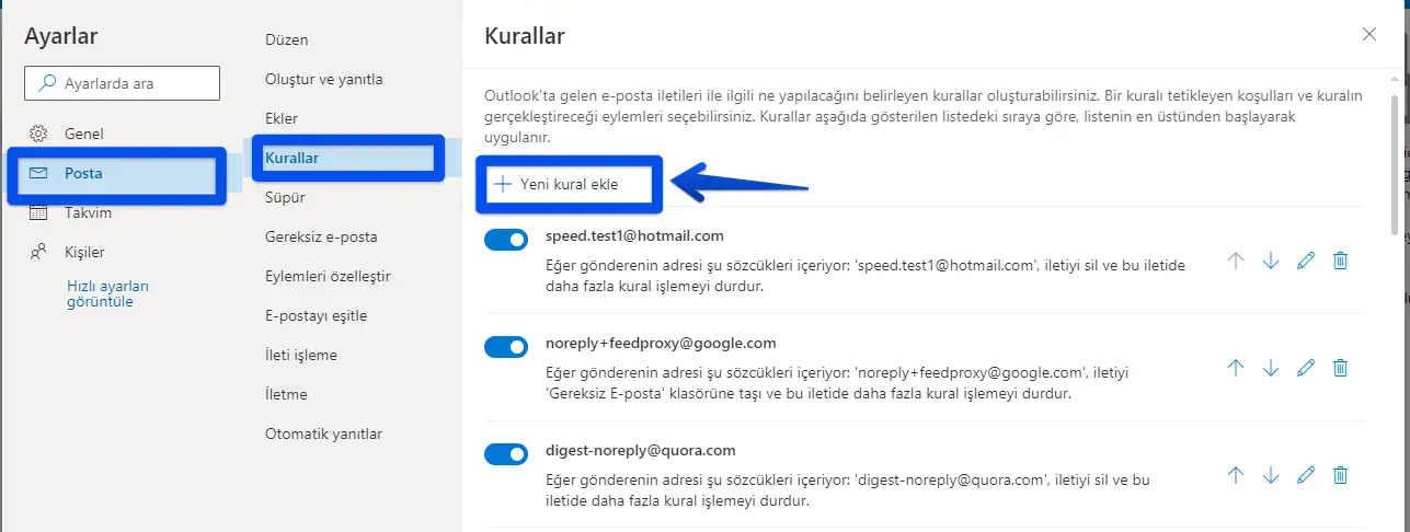 Sonrasında "Posta" > "Kurallar" > "Yeni kural ekle".