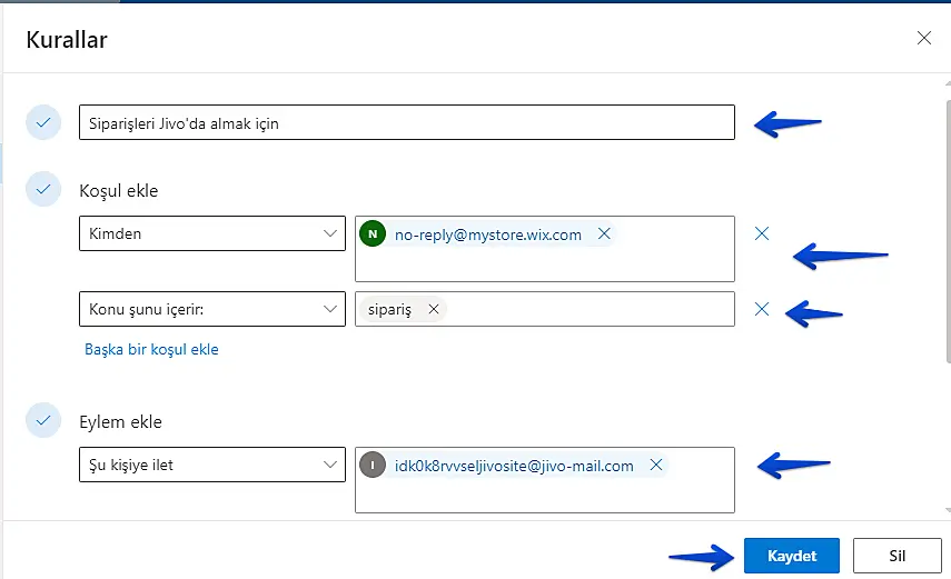 "Şu kişiye ilet" eylemini kullanın ve JivoChat'dan aldığınız adresi ekleyin.