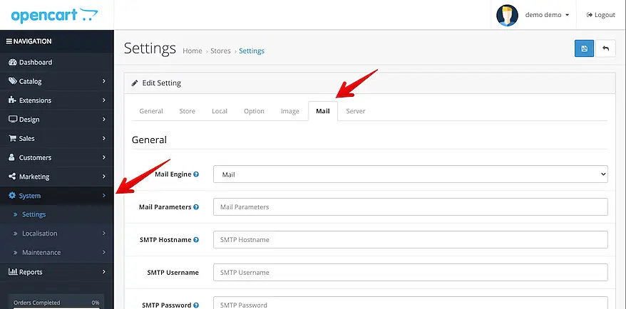 5. "Sistem" başlığının altında "Ayarlar" seçeneğine gidin ve "Mail" sekmesini seçin: