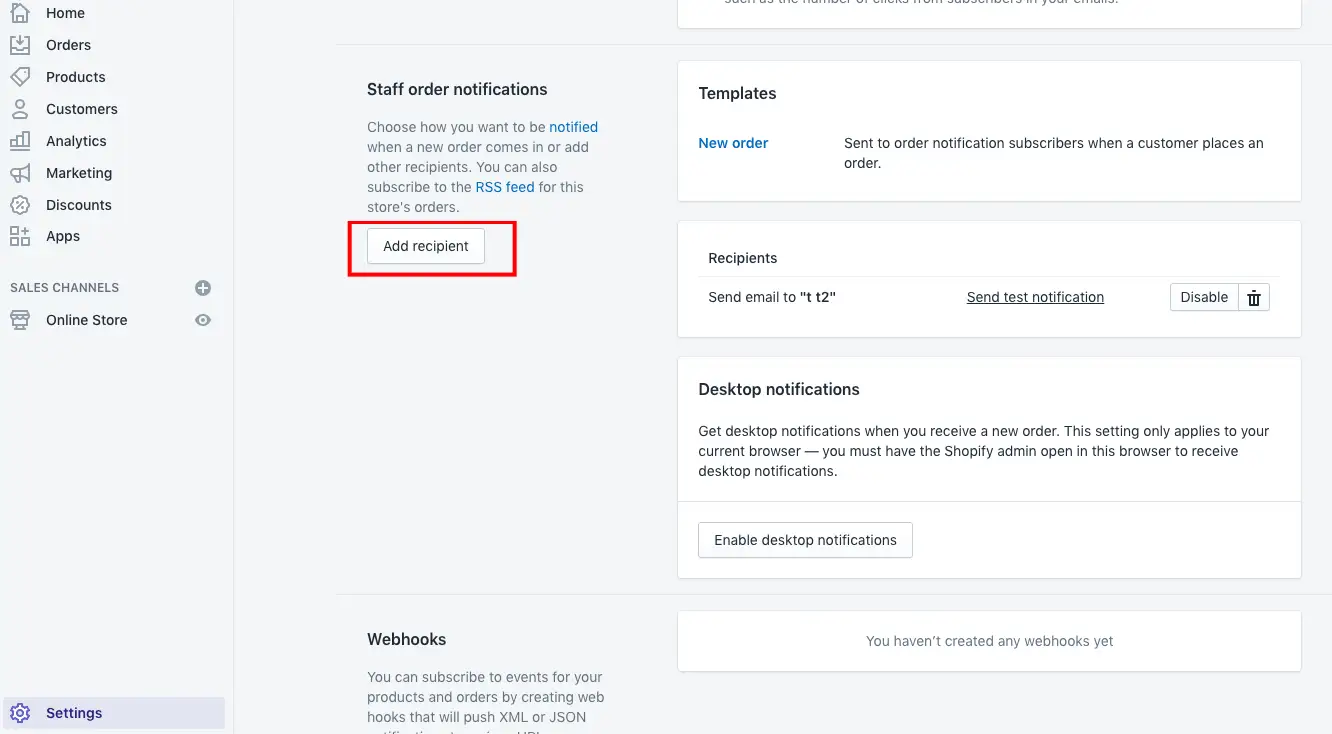 6. "Add recipient""Staff order notifications(Personel sipariş bildirimleri)" bölümünü bulun ve "Add recipient(Alıcı ekle)"yi tıklayın.