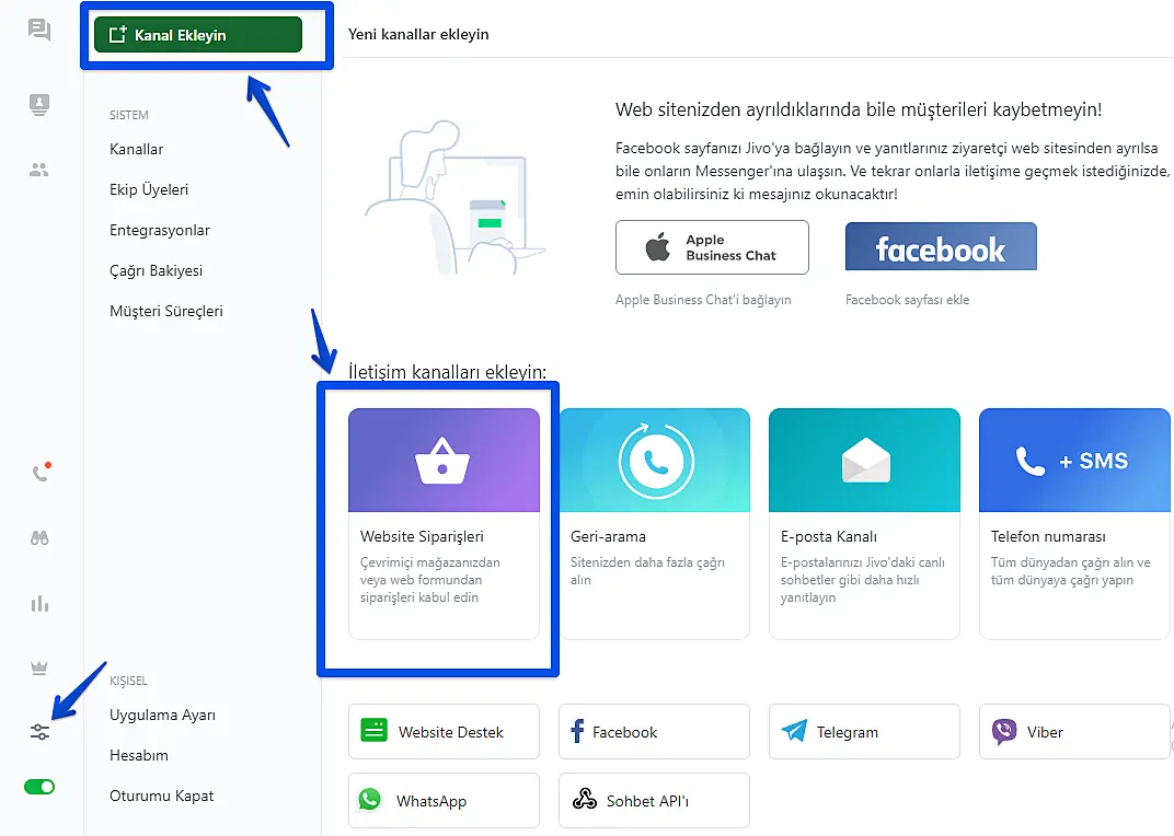 1. Öncelikle, web sitenizden siparişler / e-postalar almak için kendi benzersiz JivoChat e-posta adresinizi oluşturmanız gerekir. Bunu yapmak için JivoChat web uygulamanıza veya Masaüstü uygulamalarımızdan birine erişin ve "Yönet" -> "Kanal Ekle" -> "Website Siparişleri" ne gidin.
