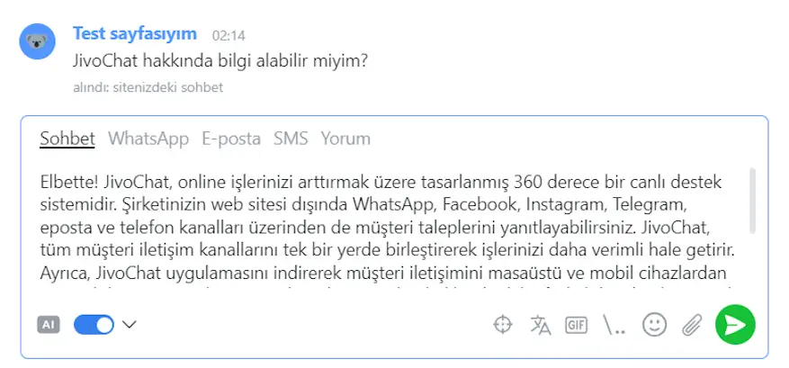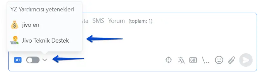 Bir sohbette otomatik yanıt oluşturmak için listeden istediğiniz asistanı seçin ve anahtarı etkinleştirin.