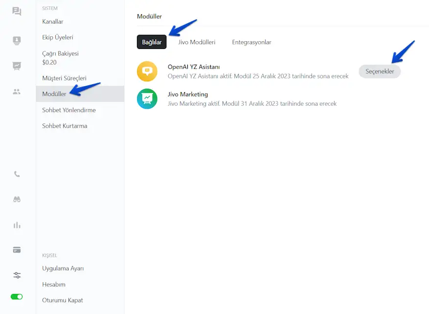 Jivo uygulamasında YZ Yazım Asistanını etkinleştirmek için "Yönet" -> "Modüller" -> "Bağlılar" bölümüne gidin "OpenAI YZ Asistanı" nın yanındaki seçenekler butonuna tıklayın,