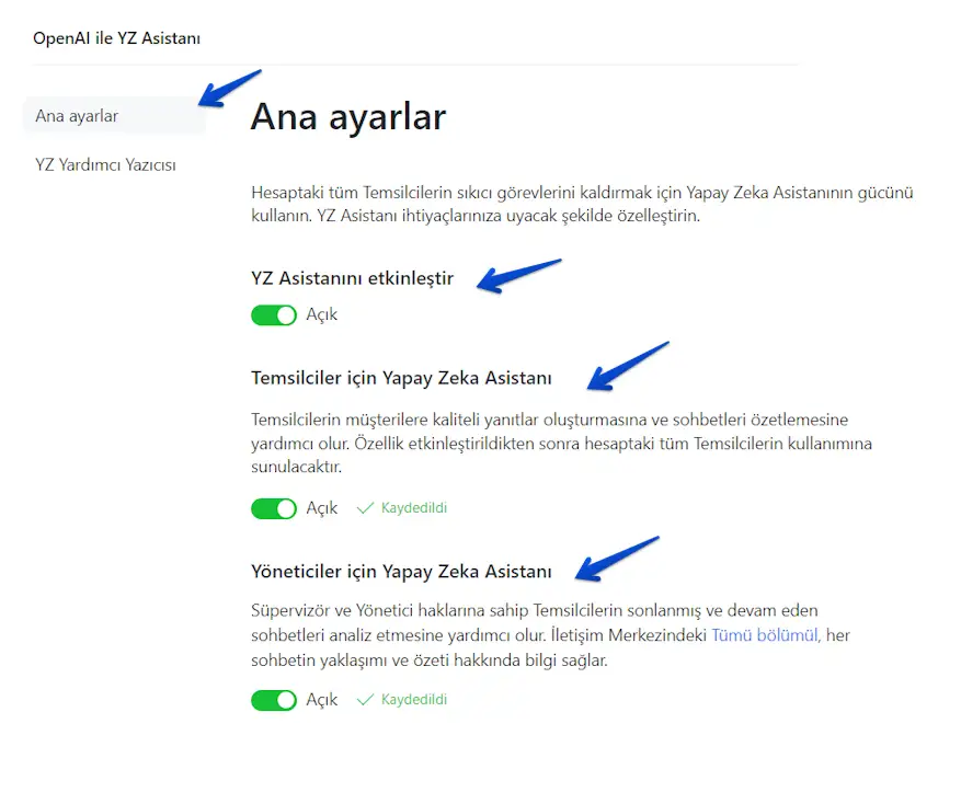 Yapay zeka asistanı tüm temsilciler tarafından kullanılabilir. Farklı kanallar için farklı asistanlar ekleyebilirsiniz. Asistanı değiştirdiğinizde, yanıt verme tarzınız da değişir.