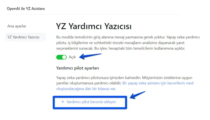Yapay zeka asistanının belirtilen parametrelere göre otomatik olarak yanıtlar oluşturmasına izin vermek için "Yardımcı pilot becerisi" ekleyin.