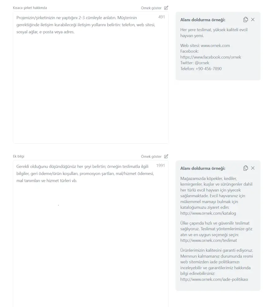 Ek bilgi - bu alanda özel olarak müşterilerden gelebilecek sorulara yönelik bilgiler, bağlantılar paylaşmaya dikkat edin. YZ asistanı bu alandaki bilgileri tarayarak yanıtlarını oluşturacaktır.