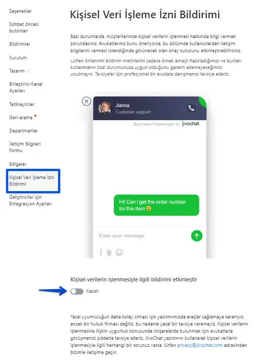Yeni KVK politikasına uymanıza yardımcı olacak yeni bir özellik getirdik. JivoChat'ta bu işlevi etkinleştirmenizi kolaylaştırmak istiyoruz.