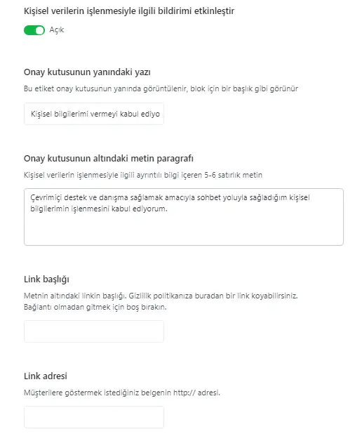 Bu 4 alan şunları içerir: gösterilecek etiket, etiketin açıklaması, link etiketi ve gizlilik şartlarınıza ait link.