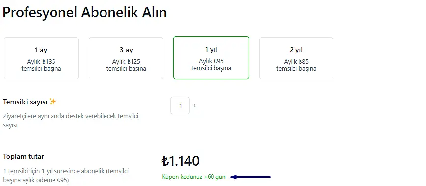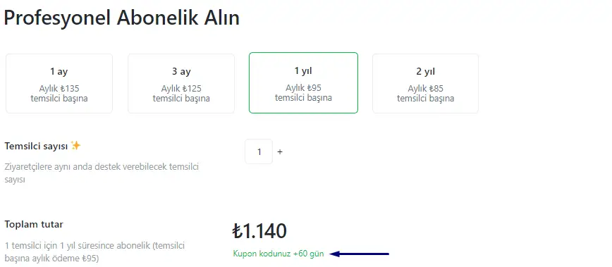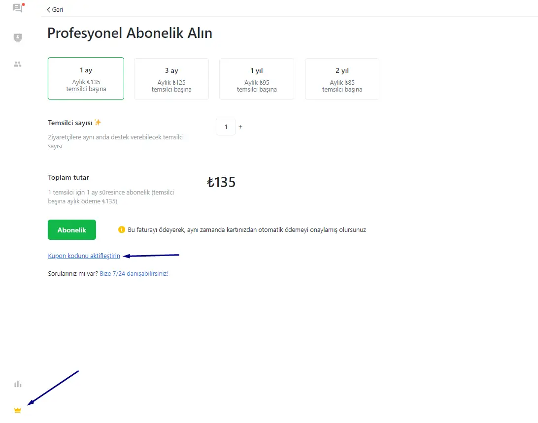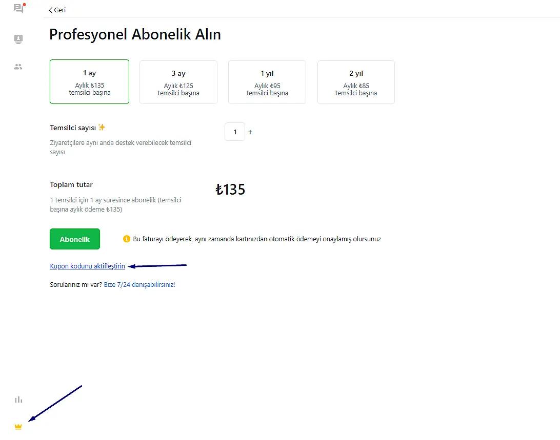 İndirim kodları, satın alım sırasında Pro lisanslarda indirim uygulamak için kullanılır. Elinizde bir indirim kodunuz varsa ve bunu JivoChat Pro lisanslarının ödeme işlemi sırasında kullanmak istiyorsanız, lütfen aşağıdaki adımları izleyin.