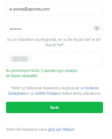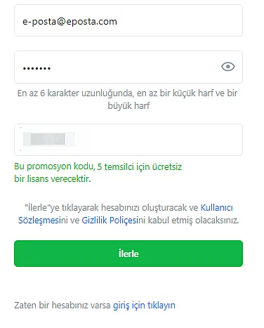 Şimdi tek yapmanız gereken kaydınızı tamamlamak ve promosyon kodunuz otomatik olarak yeni JivoChat hesabınıza uygulanacaktır.