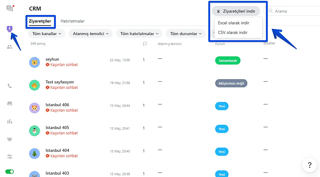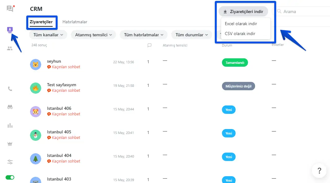 - JivoChat web uygulamasını ya da masaüstü uygulamasını açın, CRM -> Ziyaretçiler -> Ziyaretçileri indir adımlarını izleyin ve dilediğiniz formatı seçin.