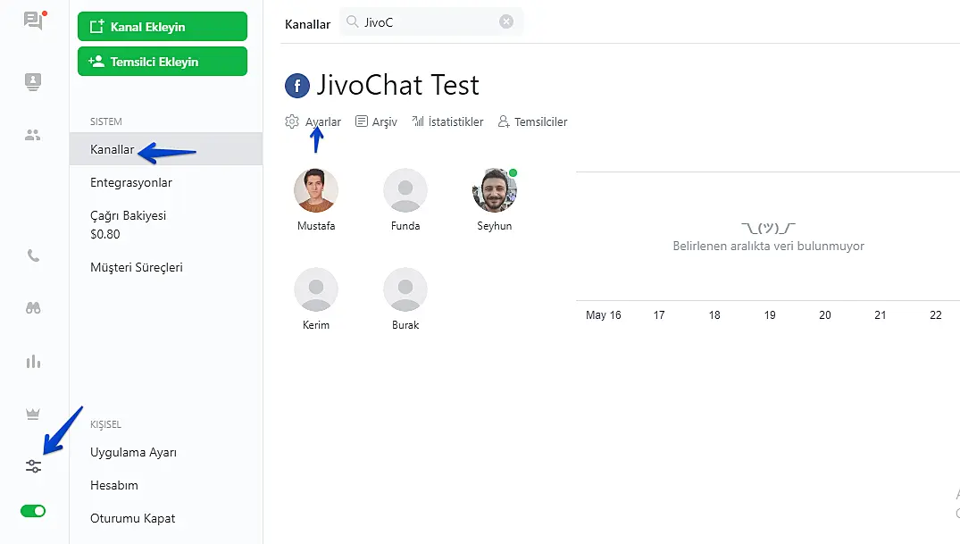 - JivoChat web uygulamasına erişin ve Yönet -> Kanallar -> JivoChat'ya bağlı Facebook sayfanızın altındaki Ayarlar'a gidin.