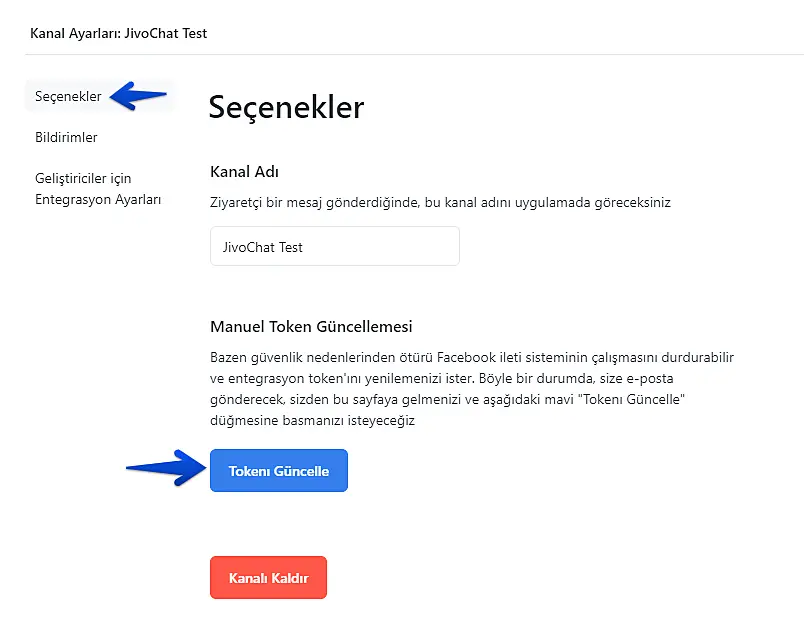 Facebook entegrasyon jetonunuzu(token) güncelleme ihtiyacı hakkında bir e-posta aldıysanız veya Facebook'tan gelen bir sohbeti cevaplamaya çalışırken bir hata mesajı görüyorsanız, lütfen entegrasyon tokenını güncellemek için aşağıdaki adımları izleyin. JivoChat'a bağlı birden fazla Facebook Sayfanız varsa, lütfen işlemi tüm sayfalarda tekrarladığınızdan emin olun.
