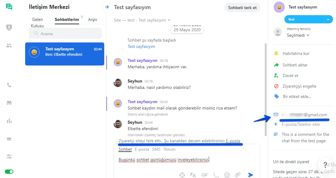 E-posta bilgileri girilmiş ziyaretçiler, web sitenizden ayrıldıktan sonra sohbetin içinde yeni bir sistem mesajı göreceksiniz ve doğrudan kişinin e-postasına ekstra mesaj gönderebileceksiniz.