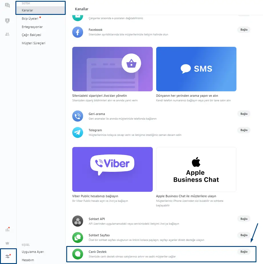 Bunu yapmak için lütfen "Yönet" -> "Kanal Ekleyin" -> "Siteniz için Canlı Destek" adımlarını izleyin.