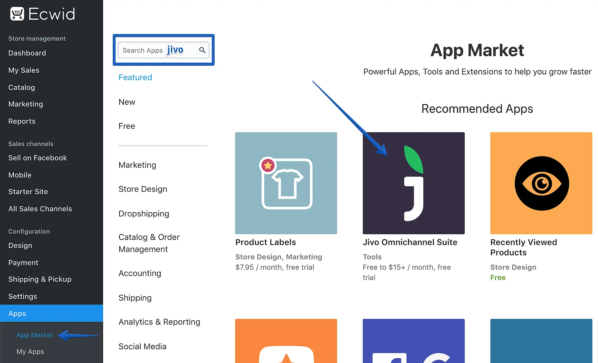2. Ecwid yönetici panelinize girin ve Apps -> App Market yolunu izleyin. "JivoChat Omnichannel Suite"i listede bulun ya da "jivo" araması yapıp uygulamamıza tıklayın.