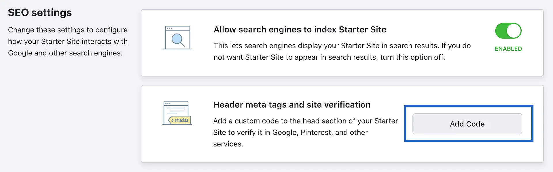 1. Starter Site'ınızı açın ve SEO settings kısmına gidin.