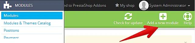 PrestaShop admin panelini açın ve Modules ekranına gidin.