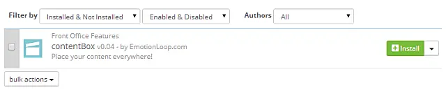 Modül listenizde yeni yüklenen ContentBox modülünü bulun ve Install'a tıklayarak kurun.